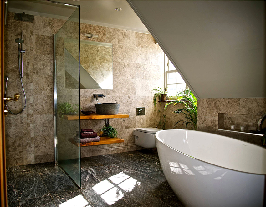 Стеклянные перегородки широко используются для зонирования пространства. С их помощью можно выделить отдельные комфортные зоны без уменьшения общей площади помещения, что особенно актуально в совмещенных санузлах. С их помощью душ отделяется от остального помещения. Обеспечивается декоративное пространство.