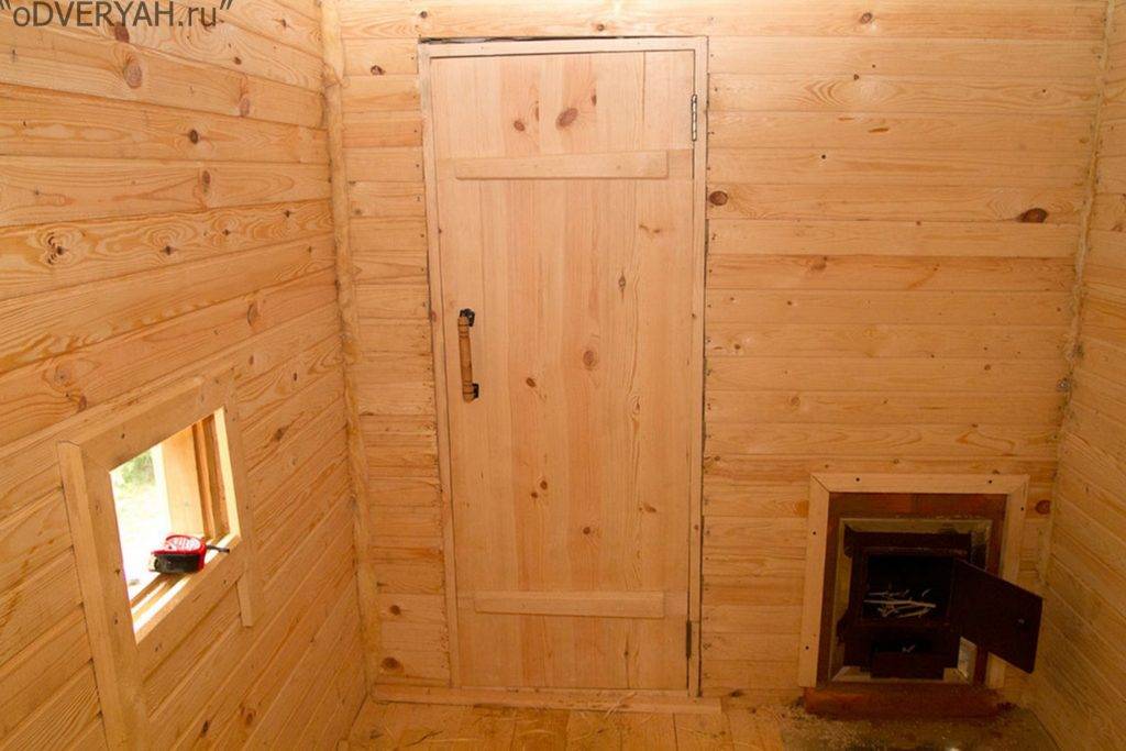 Наиболее распространенный вид дверей, устанавливаемый как в рубленных загородных банях, так и в городских постройках из современных материалов — деревянные. Их, как правило, изготавливают из кедра, осины, липы или других деревьев, отличающихся малой гигроскопичностью. Такие двери отлично сохраняют тепло, не разбухают от влаги, не выделяют вредных веществ и долгое время выдерживают резкие перепады температуры без какого-либо ущерба.