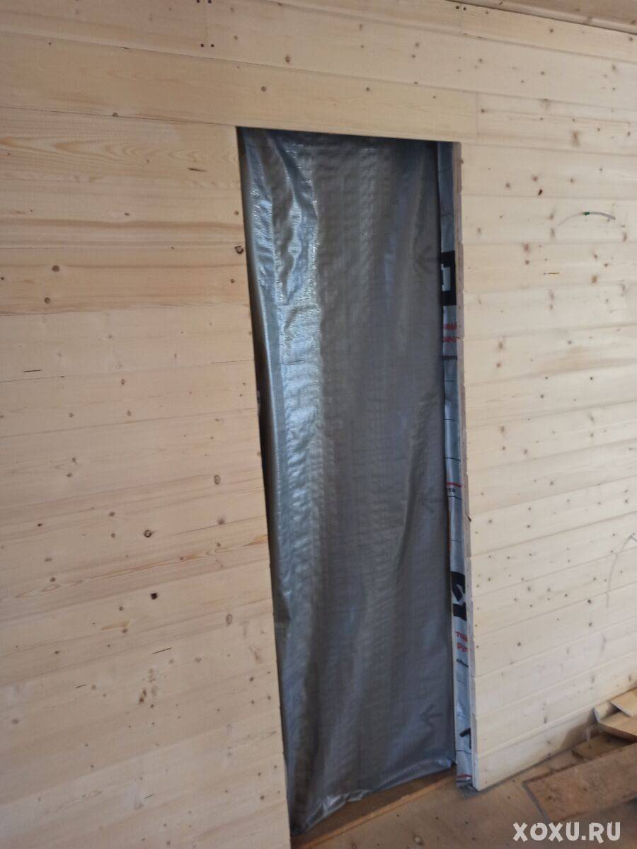 Когда дверной каркас полностью установлен и закреплён, на него навешивается полотно, на котором заранее прикручиваются петли. Проверяется открытие и закрытие двери, прилегание к брускам по всему периметру. Если отклонений нет, промежуток между брусками и стеной заполняется монтажной пеной. Полностью всю полость запенивать нежелательно, рекомендуется небольшими участками в два этапа.