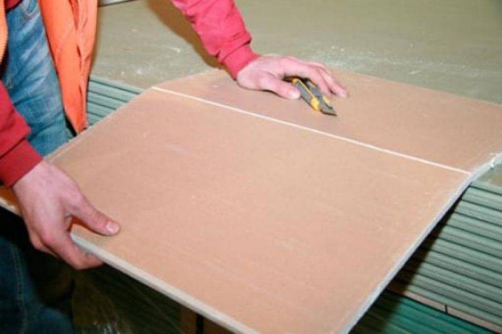 Режут этот материал острым канцелярским ножом. Гипсокартон состоит из 3 слоев, каждый из которых требуется разрезать. Для этого его укладывают на ровный стол, делают срез вначале одного слоя картона. При этом частично разрезается и слой гипса, расположенный в центре между двумя листами. Место среза сдвигают к краю стола, подкладывают брусок и, слегка постукивая, обламывают гипс. Осталось перевернуть лист и разрезать второй слой картона