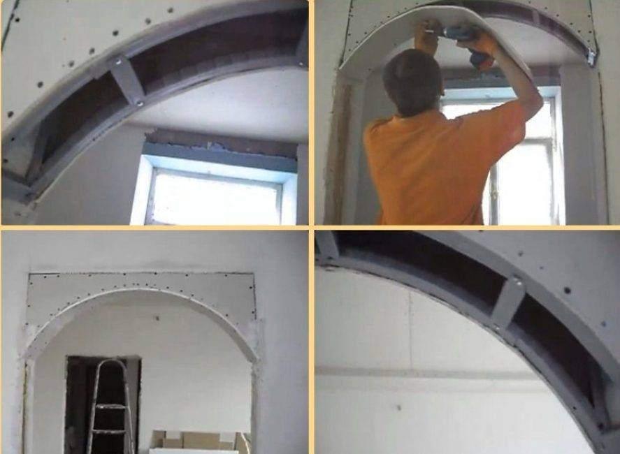 Для создания арок используется арочный гипсокартон меньшей толщины. Согнуть можно и обычные листы. Делается это двумя способами (см. фото). При сухом методе с одной стороны листа делаются множественные надрезы. Причем чем чаще они расположены, тем плавнее и круче получится изгиб