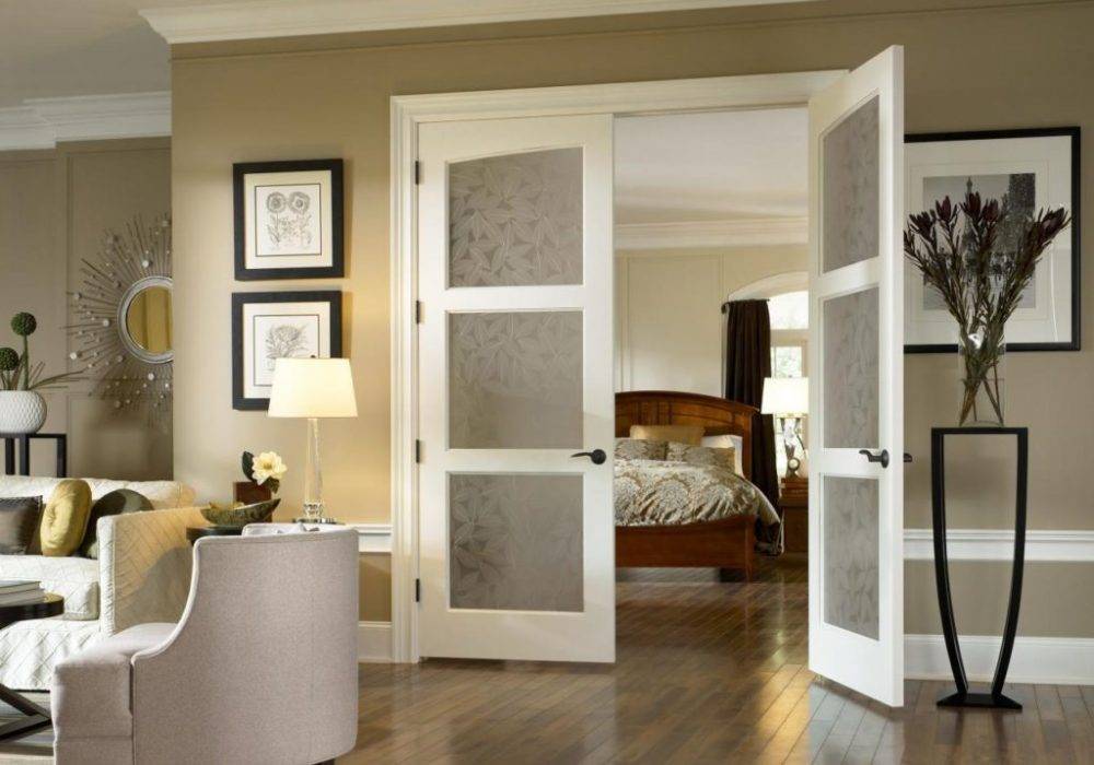 Очень красиво смотрятся белые створки с английским остеклением. Белый цвет выгоден тем, что дверное полотно не загораживает и не затеняет проход в комнату.