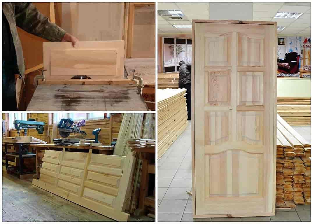 Филенка из массива дерева – это не цельный кусок. Она собирается в своеобразный щит из наборных брусьев одинаковых размеров путем проклеивания каждого бруска клеем ПВА. Собранные бруски зажимаются струбцинами до полного высыхания. Потом этот щит прогоняется через станок рейсмус для выравнивания поверхности. Затем края этого щита обрабатываются на фрезерном станке для придания рисунка, и готовая филенка вставляется в пазы каркаса двери.