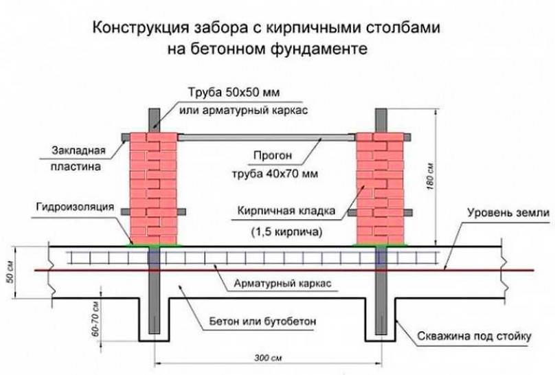 Правильный фундамент под кирпичный забор. Приведенная инструкция позволит без особого труда залить основание для ограждения даже новичку. Специалисты рекомендуют для средних широт континента выкапывать ямы для забора из кирпича глубиной до 1,0-1,2 м. Утрамбовка ям песком необходима для сохранения устойчивости кирпичного сооружения и уменьшения колебания грунтовых вод. При установке опорных столбов можно воспользоваться методом укрепления каркаса с помощью прутьев арматуры.