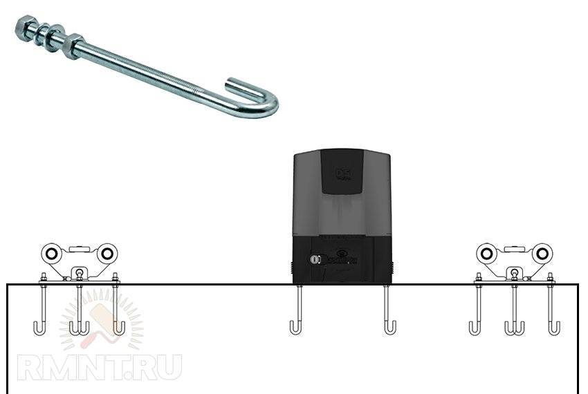 Закладные анкеровки для крепления привода устанавливаются группами в трёх местах: по центру каждого столба, где будут установлены опорные ролики, и в произвольном месте между ними, где планируется размещение самого приводного механизма.