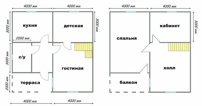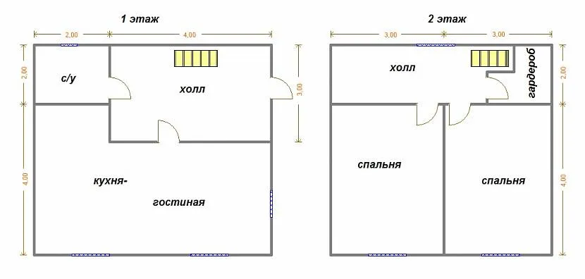Планировка двухэтажного дома с двумя спальнями на мансардном этаже