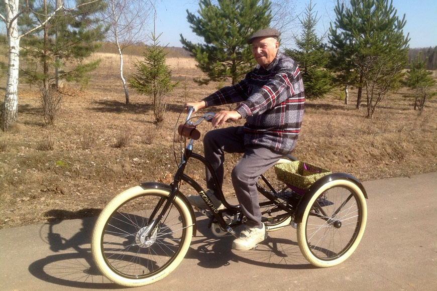 Мы очень рады, что трицикл – наш подарок Владимиру Абрамовичу Этушу не простаивает в гараже, а активно используется великим артистом по назначению!