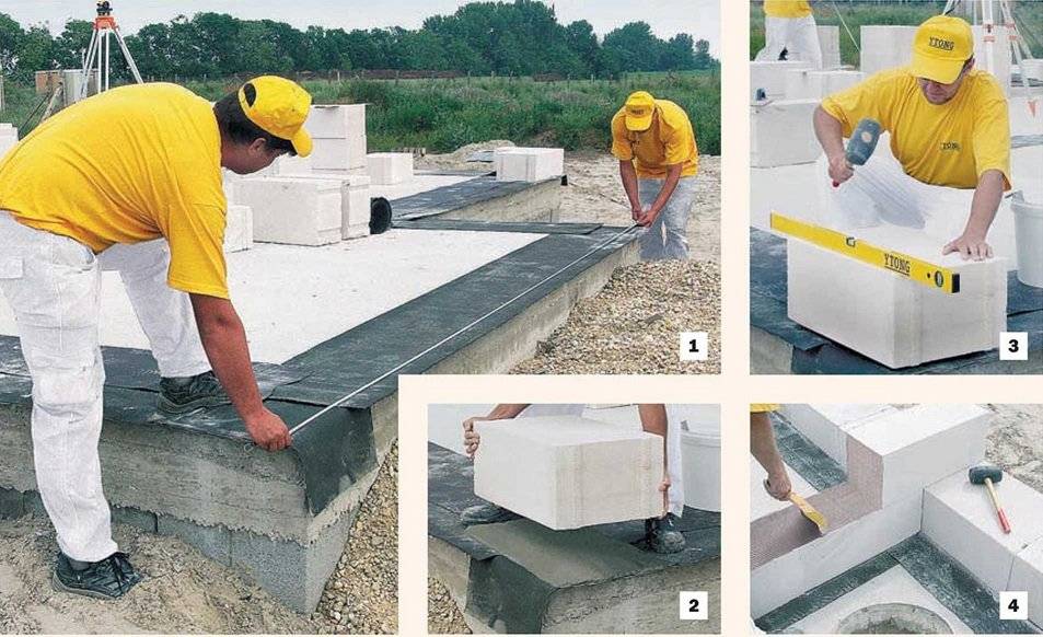 Затем на слой гидроизолирующего материала снова укладывается слой раствора (толщина примерно 2 см) и уже на этот слой раствора начинается кладка стен кирпичей газобетона. Выполнять кладку лучше, начиная с угла, кирпичи выкладываются в обе стороны, формируя замок газоблока.