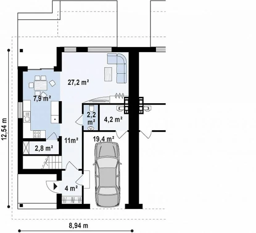 Планировка первого этажа коттеджа с встроенным гаражом Источник stroydom-taldom.ru
