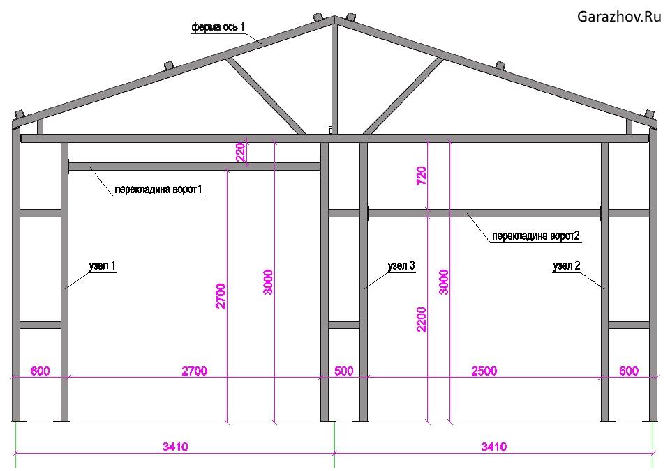 Получается контур параллелепипеда, который постепенно дополняется стойками, рёбрами жёсткости из профилей 5х5 см, при необходимости — конструкционными элементами внутреннего устройства гаража.