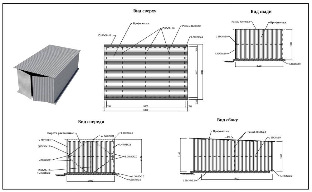 Чертёж гаража из профлиста, сделанный с помощью специальной программы