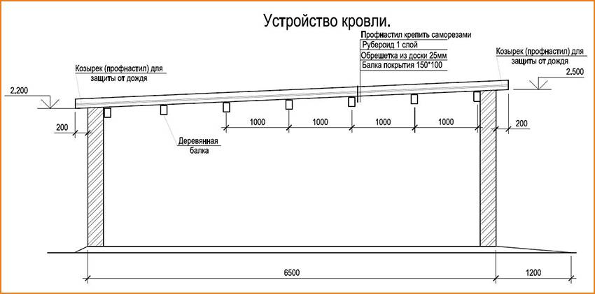 Затем на него монтируются стропила под определенным углом. Дерево должно быть высушено и обработано антисептическим составом. Конструкция должна выступать за края крыши гаража примерно на 20 см.