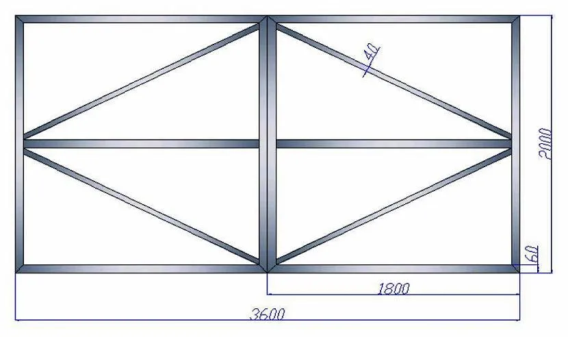 На каждую створку потребуется по две петли. Самая сложная задача – точно выставить створки по высоте, и чтобы петли, а точнее, две их части совпадали между собой. Поэтому сначала изготавливается каркас гаражных ворот. По сути, это два прямоугольника, внутри которых установлены дополнительные элементы, придающие конструкциям жесткость. Это могут быть отрезки профилей, установленные вертикально или горизонтально, или по диагонали. В некоторых случаях используют комбинированную установку. На фото ниже показан эскиз комбинированного каркаса гаражных ворот.