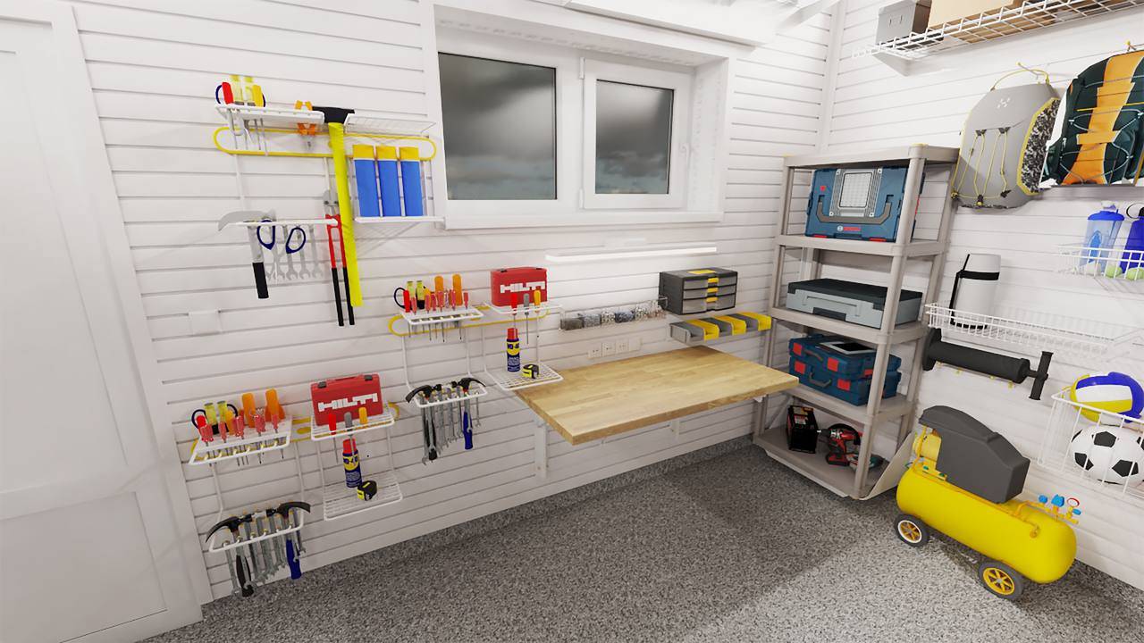 Рабочая зона гаража обычно подразумевает наличие стола. Его, как правило, располагают во всю ширину дальней стены, вдоль боковой или в углу. Размер стола рассчитывают, ориентируясь на два параметра — потребности владельца и свободная площадь. Если свободного пространства совсем мало, то удачным вариантом станет создание навесной столешницы. Для её сооружения потребуются: