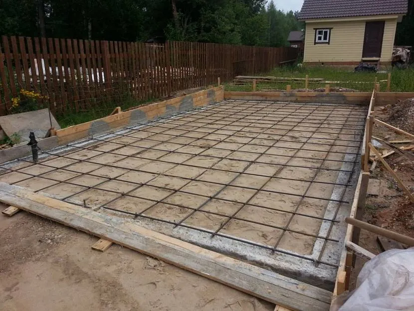При строительстве фундамента в виде плиты для деревянного гаража, своими руками нужно выкопать неширокую яму по всему периметру будущей плиты и сделать опалубку. Внутри нее насыпают слой песчано-гравийной смеси толщиной не менее 15 см. Армирование основания плиты производят с помощью сеток из металлических прутьев. Подготовленное основание заливают бетоном. После истечения трехнедельного срока, достаточного для полного высыхания фундамента, приступают к установке конструкции.