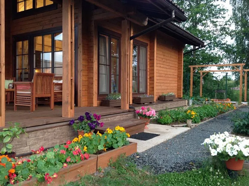 Горшечные растения в керамических горшках и деревянных кадках расставлены по дому, оживляя атмосферу дома. Букеты полевых и горных цветов украшают спальню и гостиную, наполняя воздух неповторимым свежим ароматом.