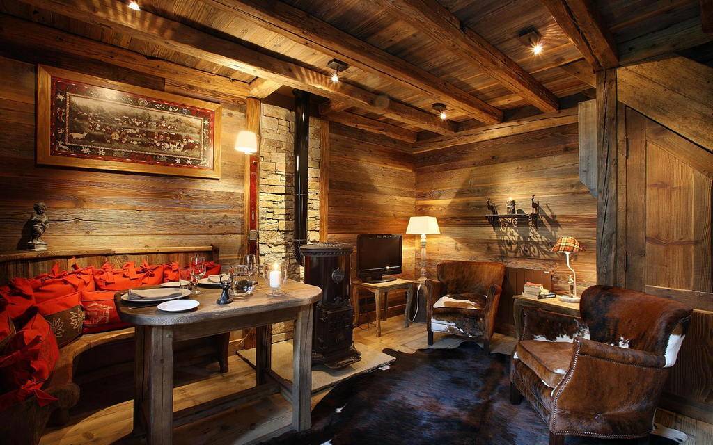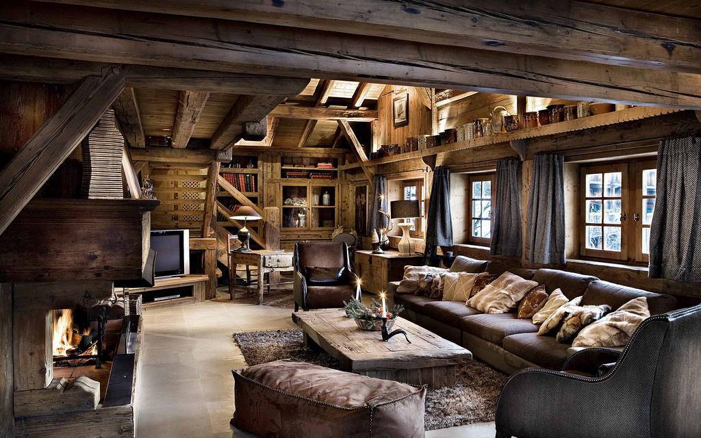Таким образом, шале характеризуется применением исключительно натуральных материалов в отделке, превалированием дерева, простотой, минимумом обработки, отсутствием вычурности и роскоши, включением предметов ручной работы, использованием в качестве украшений охотничьих орудий и трофеев, большими габаритами мягкой мебели и наличием камина.