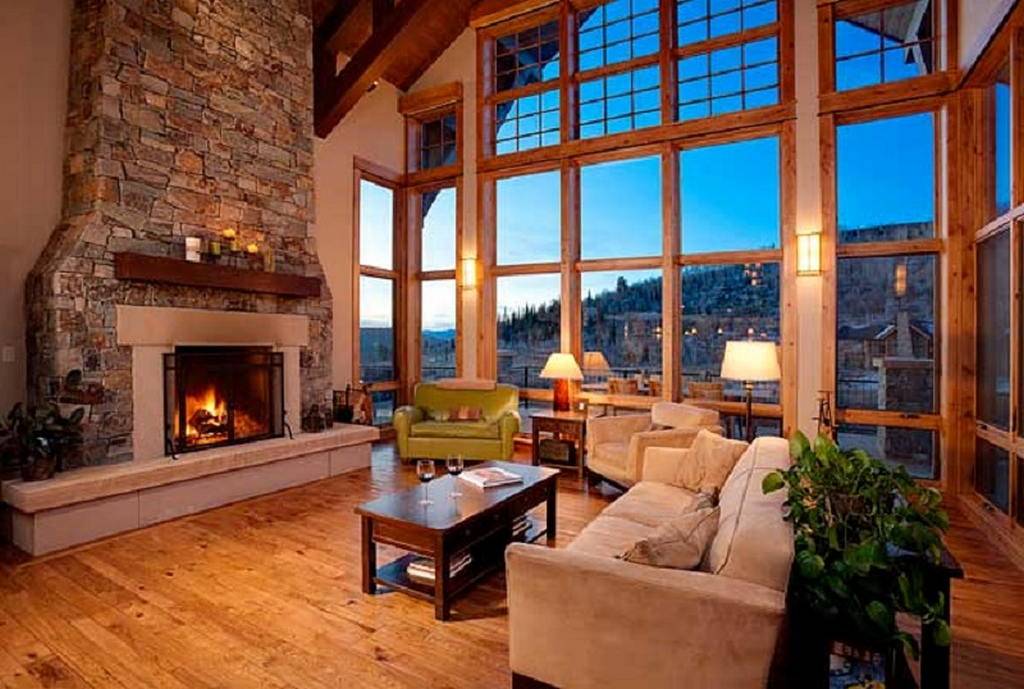 Большое количество окон с квадратной обрешёткой и обрамлением из бруса позволяет быть как можно ближе к природе и наслаждаться ее красотой. Мягкий свет способствует появлению теней и контрастов между освещенными и неосвещенными участками. Это помогает расставить акценты и завуалировать слабые места. Старинные круглые люстры, массивные, с лампами, имитирующими свечи, выполненные из чугуна или дерева прекрасно вписываются в интерьер шале. Торшеры и настольные лампы с тканевыми абажурами дополняют основное освещение уютным домашним светом.