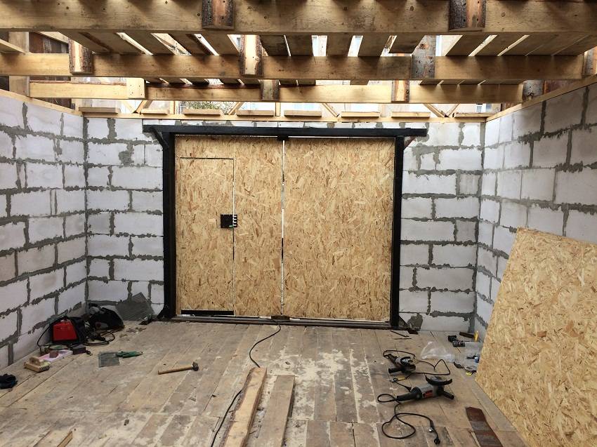 Изнутри можно обшить каркас листами фанеры и покрасить краской с добавлением антипиренов. В деревянных гаражах ворота устанавливают в последнюю очередь, чтобы постройку не повело под тяжестью металла.