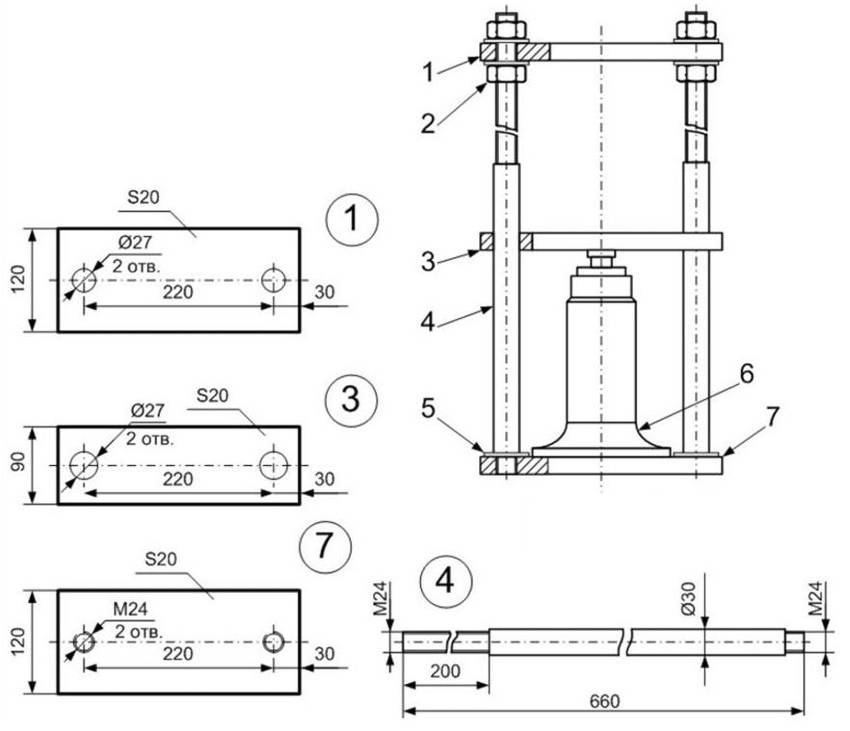 1 — верхняя упорная балка, 2 — гайка, 3 — нижняя передвижная балка, 4 — стойка, 5 — резьба, 6 — домкрат, 7 — основание