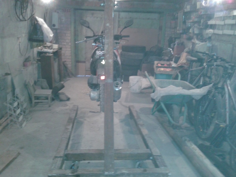 самодельного гидравлического крана «Гусь» по сути довольно простое, да и само название говорит само за себя) Состоит из опоры (разборная) с колесиками для передвижению по гаражу и подкату под автомобиль, вертикальной стойки с домкратом и непосредственно самой выдвижной стрелы с цепью и крюком.