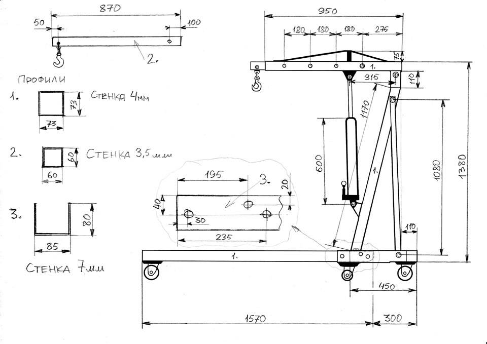 » из представленного материала вы узнаете, как самостоятельно собрать гаражный гидравлический кран гусь, рассмотрим чертежи, пошаговые фото сборки, а так же видео испытания самодельного крана для демонтажа двигателя.