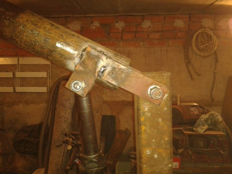 – установка домкрата. Для этого готовятся специальные упоры на стойке и стреле. Они должны быть подвижными, тогда угол крана будет меняться во время работы. Домкрат устанавливается под углом от основания рамы к стреле, он будет принимать на себя основную нагрузку при подъеме тяжестей.