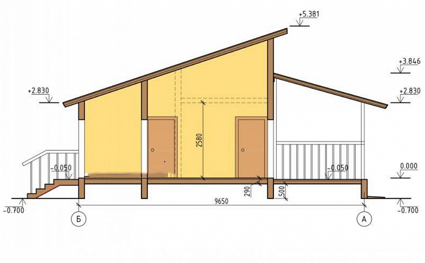 Общая площадь дачного домика составляет 73 м2, высота потолков первого этажа и мансарды составляет 2,7 м и 2,6 м соответственно, что является очень неплохим показателем для дачных построек. Стены и фронтоны здания по проекту собираются из бруса сечением 40х150 мм, обшиваются ОСБ и гипсокартонными плитами. Аналогичным способом собирается помещение мансарды.