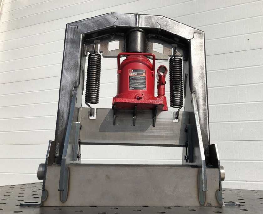С двух сторон домкрата закрепляют пружины: одной проушиной к основе рамы, а второй — к подвижному столу. Их предназначение – сжатие домкрата в изначальное состояние, когда шток не выступает (размер и жесткость пружин подбираются соответствующими). Также можно сделать вариант, когда на шток надето приспособление в форме оправки, куда крепят одну проушину, а другую крепят к основанию.