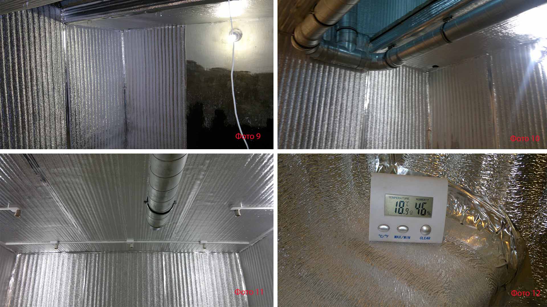Клеить теплоизоляцию на потолок одному проблематично, здесь без помощника не обойтись, стыки заклеил блестящим скотчем. После проведенных работ по гидроизоляции результат – влажность 46% (фото 12), подвал для выращивания грибов вешенки готов к эксплуатации.