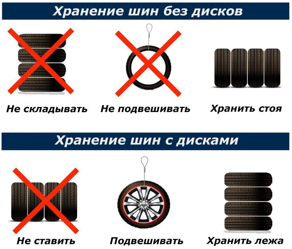 Долгое воздействие острого ребра негативно сказывается на колесах. Шины стандарта до 205 миллиметров можно укладывать друг на друга. Максимальная высота такого штабеля составляет 2 метра. Более крупные шины (215 миллиметров и более) следует хранить вертикально, укладывая в ряды.