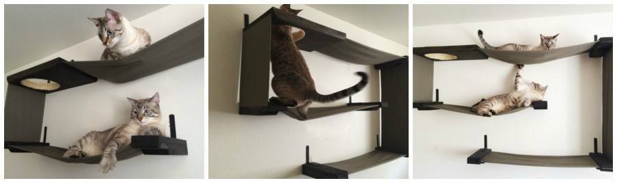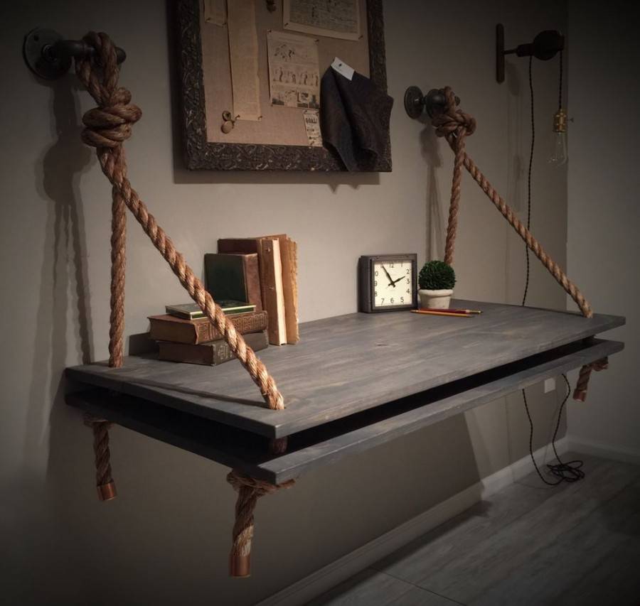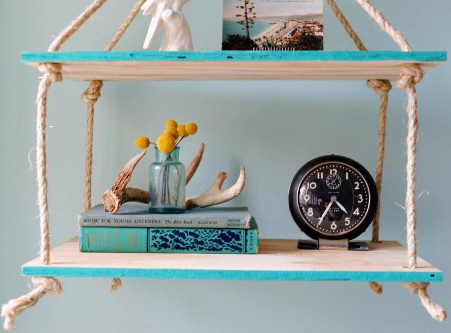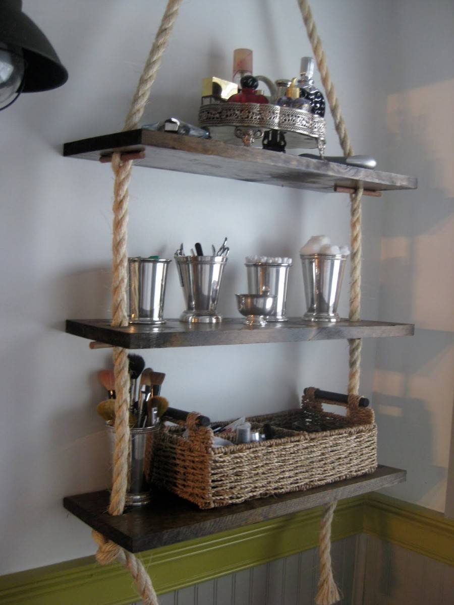 Не менее оригинальны и веревочные стеллажи, для крепления которых, в отличие от традиционных каркасных конструкций, потребуется только два крюка на стене. Конечно, тяжелые банки с заготовками на зиму вы хранить на них не сможете, однако фотографии, сувениры, книги, посуду и другие мелочи с легкостью расставите. Веревочные стеллажи, будучи временными конструкциями, пойдут и для помещений, подлежащих ремонту. В этом случае достаточно смастерить конструкцию из обрезков осок или ламината, закрепленных на веревочном подвесе. Закрепление конструкции облегчится в том случае, если в помещении, где она будет расположена, под потолком пролегает труба отопления – достаточно будет привязать к ней веревку.