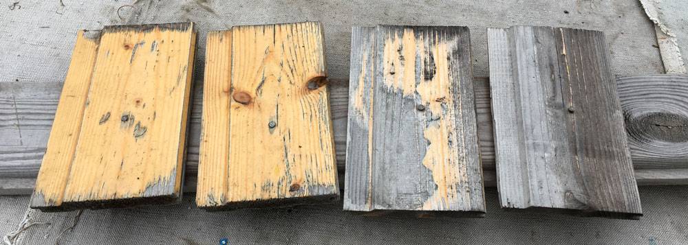 На фото они расположены в обратном порядке относительно исходного фото. Ну, просто вверх ногами сфотографировал, а переснять уже не получится. Самая правая дощечка совсем не была обработана. Нельзя сказать, что она сгнила, но стала серой. Таким со временем становится новенький деревянный забор, который люди ставят вокруг участка. Вторая дощечка была обработана пропиткой – результат почти тот же. Лишь местами, где слой оказался толще, покрытие сохранило свой первоначальный цвет.