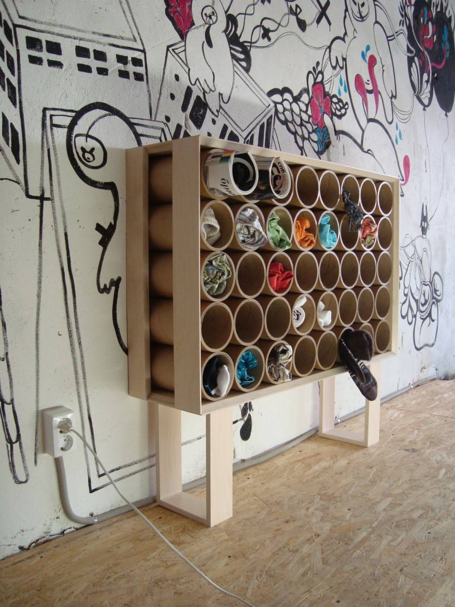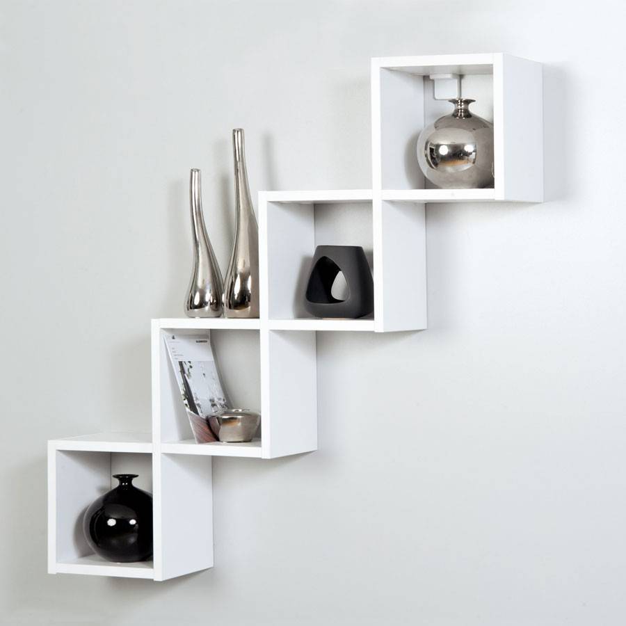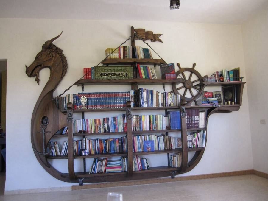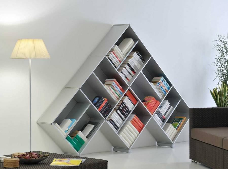 Такие стеллажи могут не только устанавливаться на пол, но и подвешиваться на стену на крюках. Асимметричное расположение полок или перегородок, округлые и зигзагообразные их формы превращают стеллаж в яркий элемент интерьера. Но это уже работа для опытных мастеров. Под стеллаж можно занять и свободное место под лестницей, поднимающейся на второй этаж.