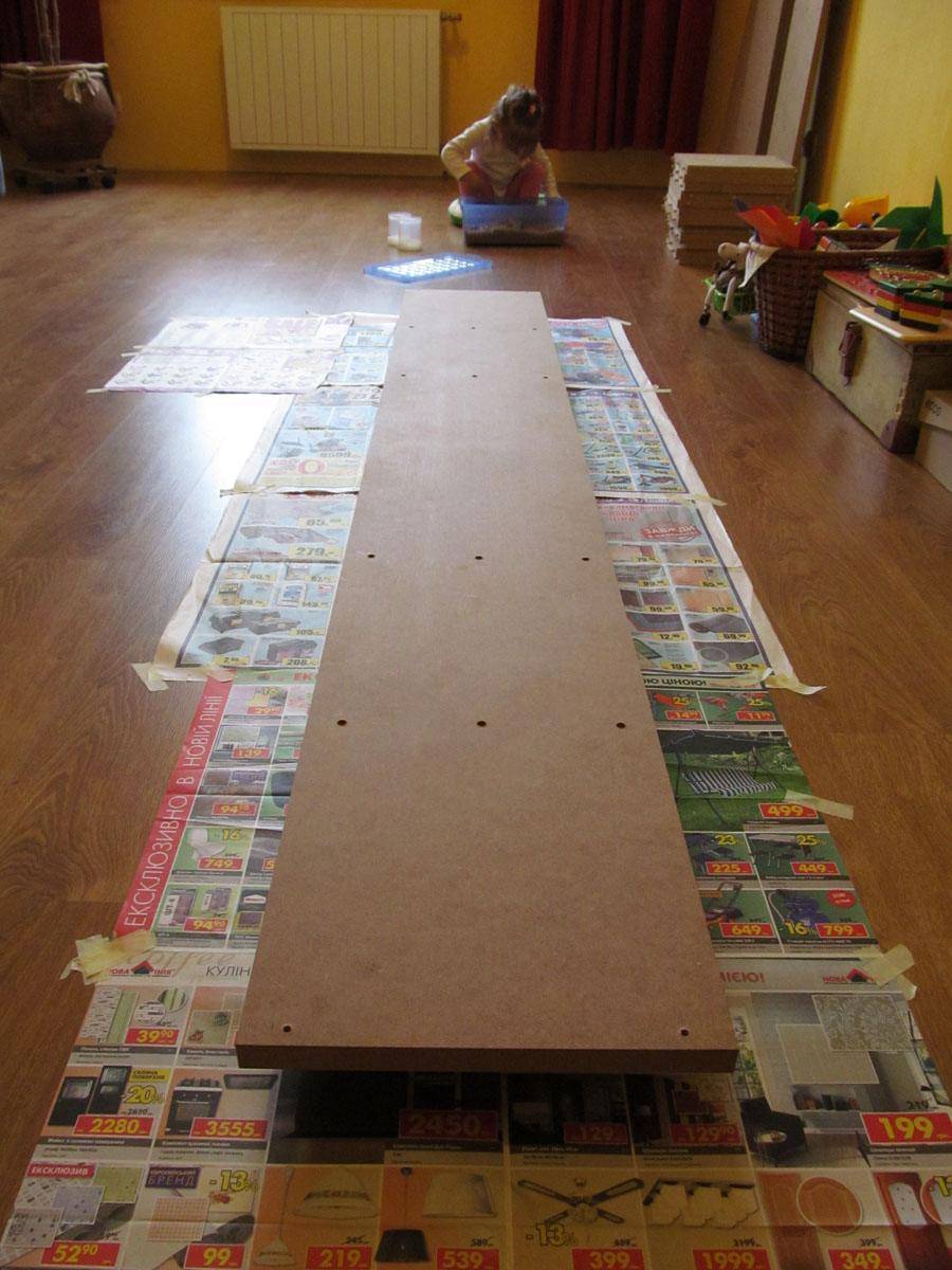 Разбираем весь стеллаж на части. На рабочую зону кладем бумагу или газеты. Окрашиваем заготовки акриловой краской белого цвета.