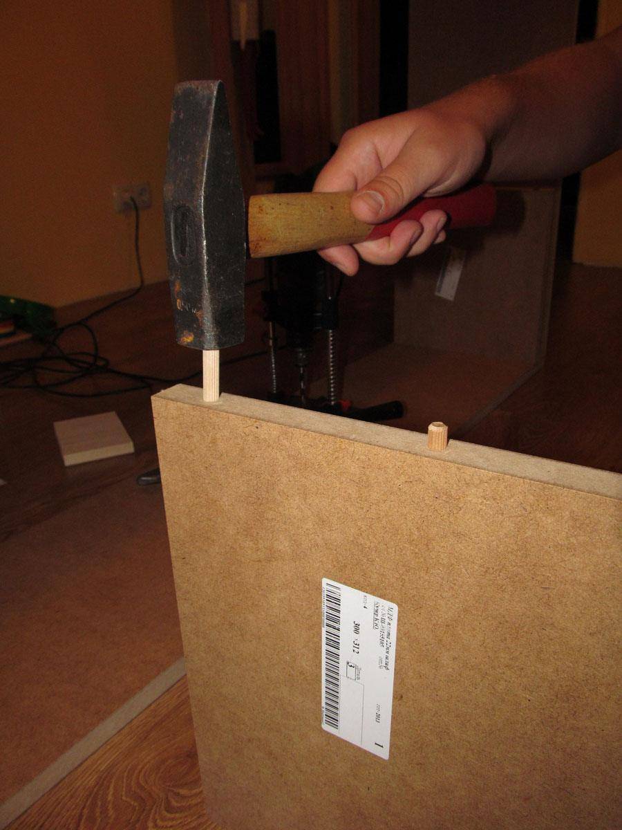 Сверлим отверстия под шканты и забиваем их. Устанавливаем деталь на место и таким же образом делаем первый ряд стеллажа.