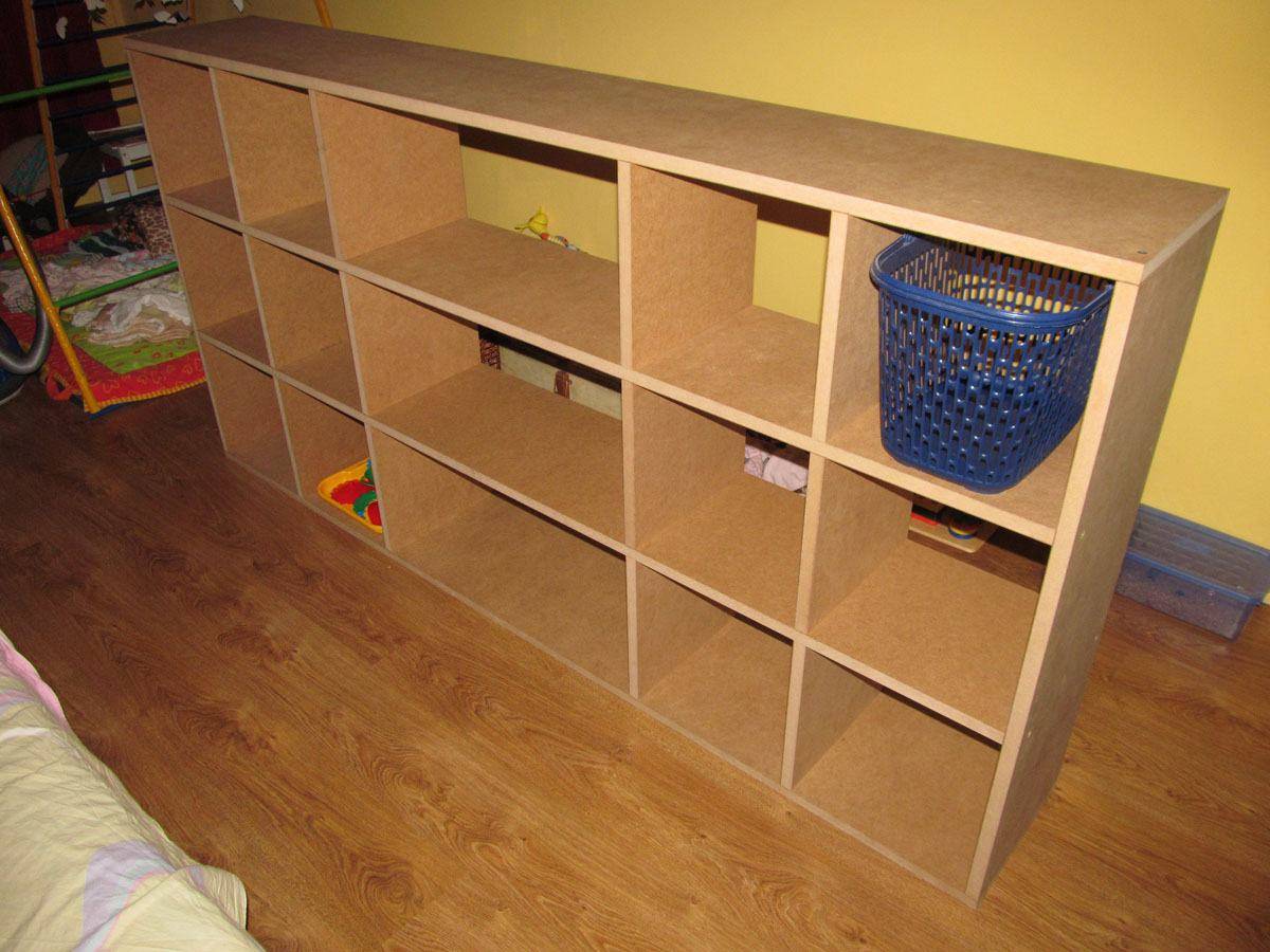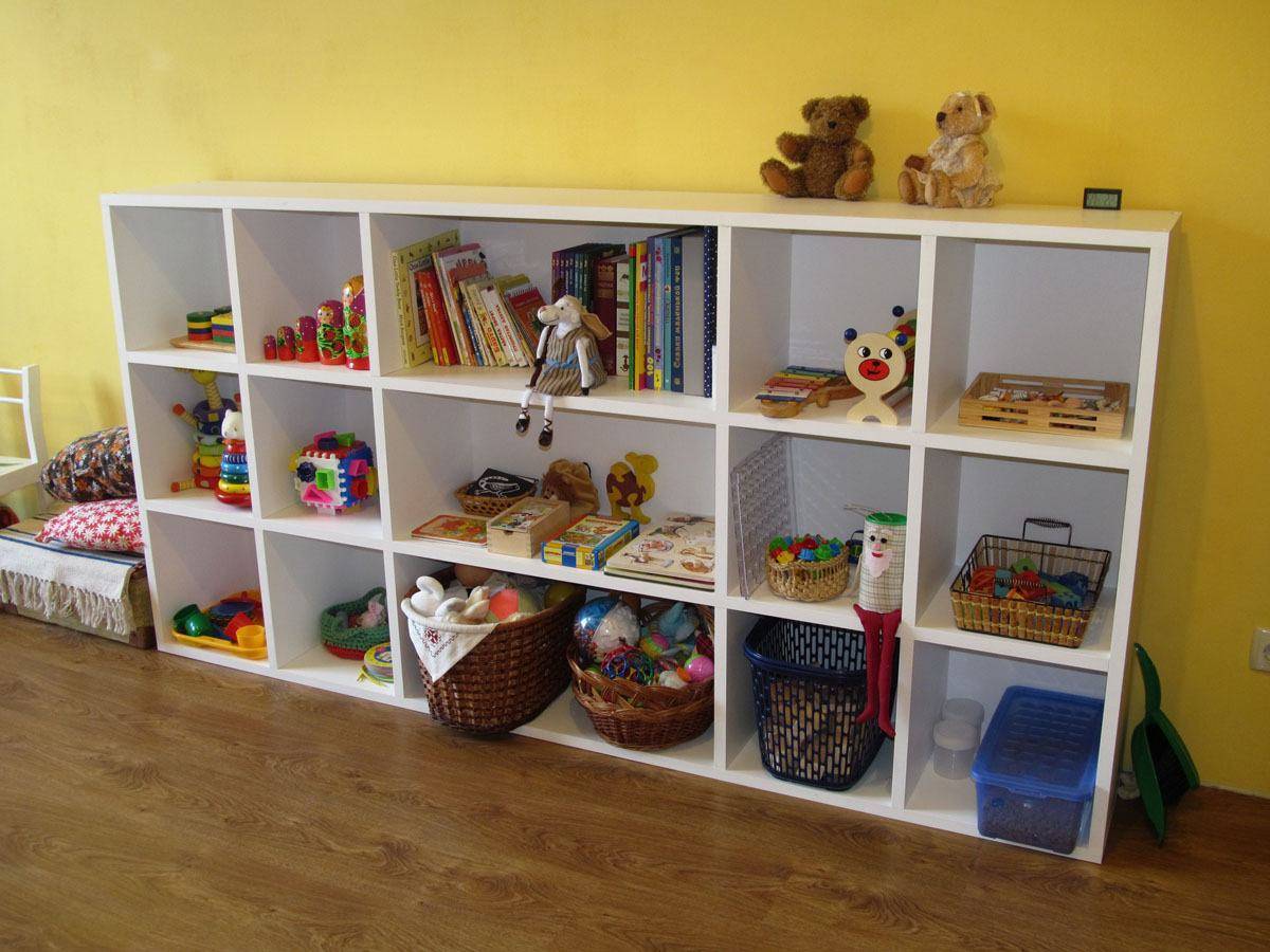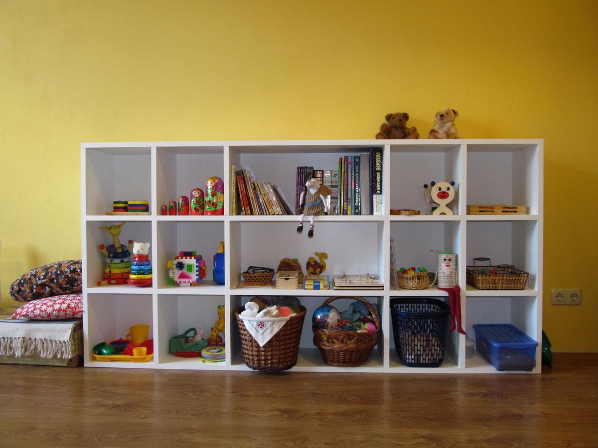 Устанавливаем стеллаж в детскую комнату и заполняем игрушками или другими вещами.