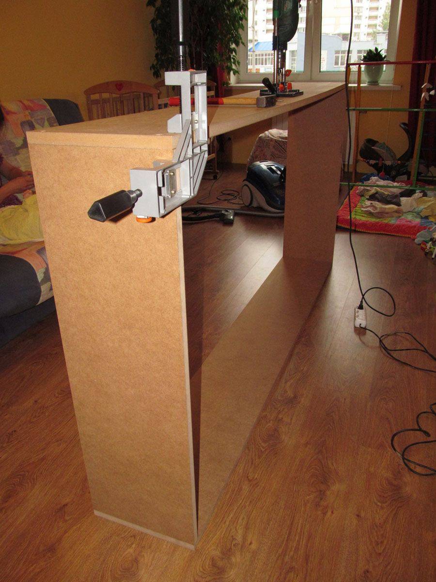 Берем самые длинные детали, собираем внешнюю сторону стеллажа и фиксируем с помощью угловой струбцины. Это нужно для того, чтобы конструкция была достаточно жесткой и не прогибалась во время установки полок.