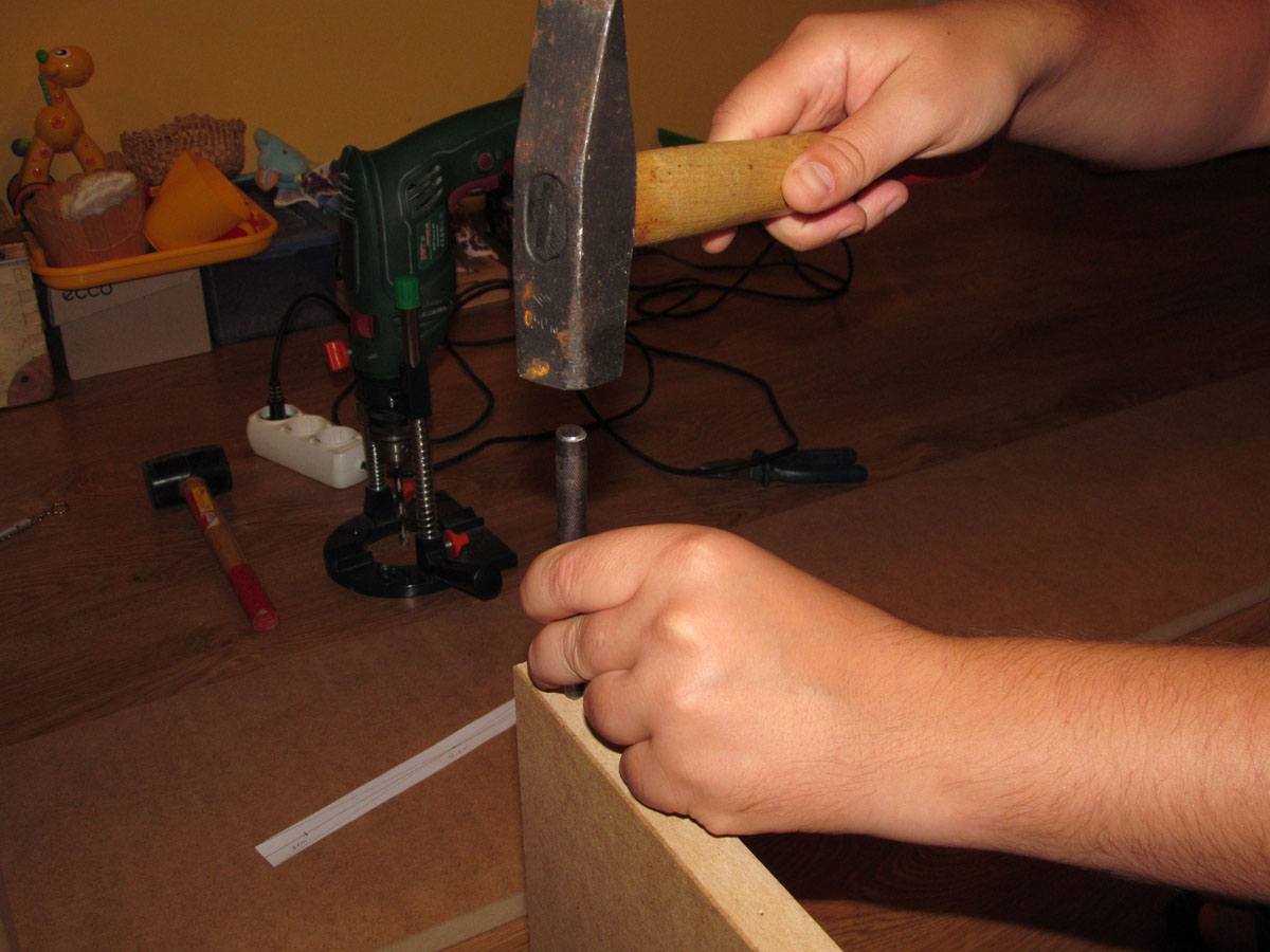 Используем еще одну полку в роли шаблона. Ставим ее и ударяем молотком, чтобы перенести отметки.