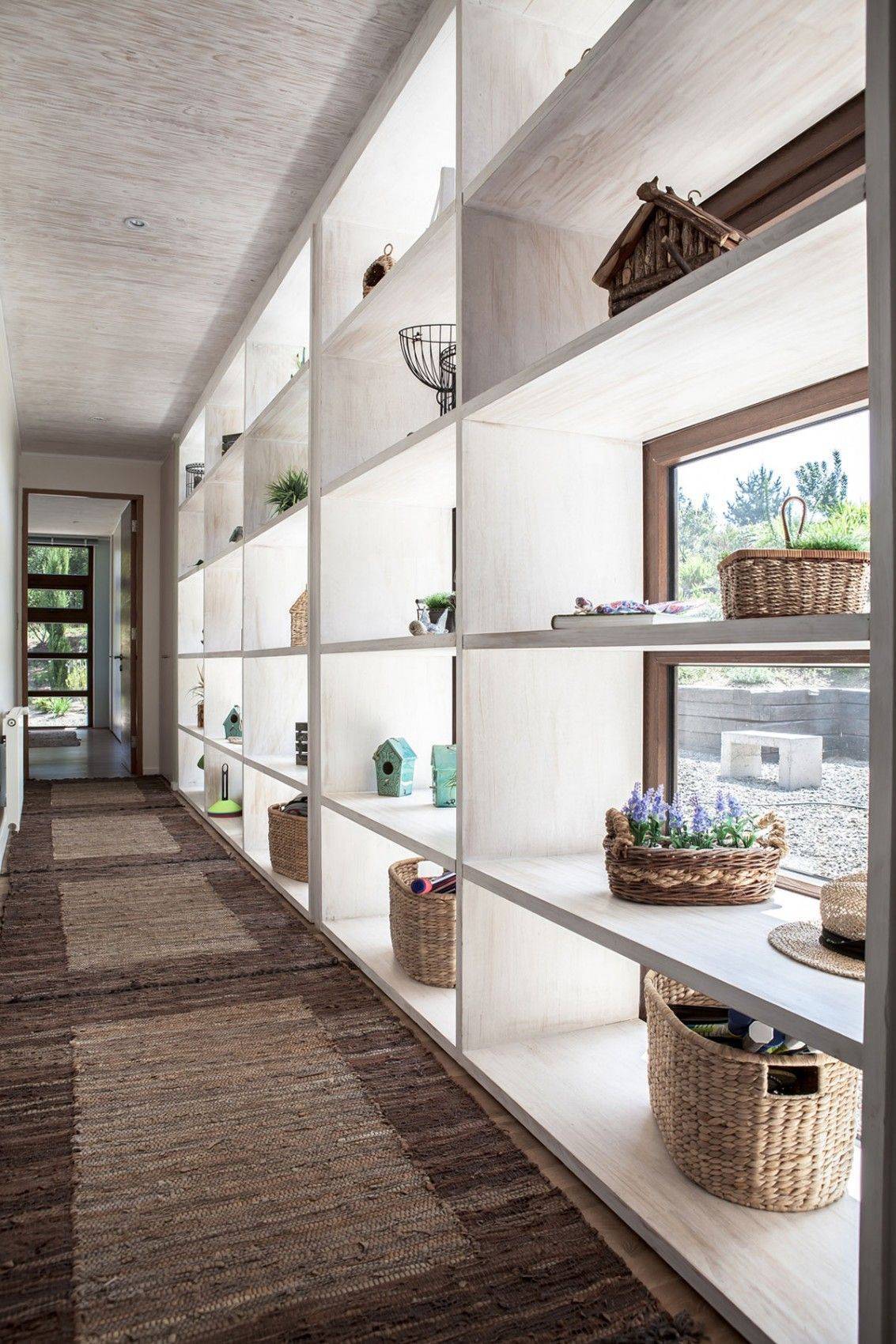 Если вы решили оптимизировать жилую площадь в частном доме, где есть лестница, ведущая на второй этаж, пространство под ней можно использовать для обустройства стеллажа, как показано на фото.