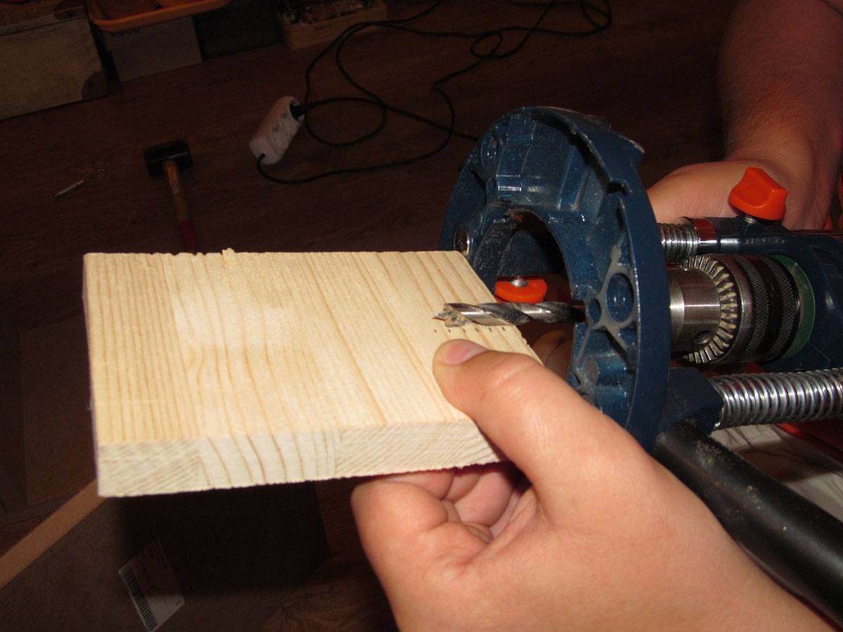 Складываем все доски в одну стопку. С помощью сверла и электродрели делаем отверстие в первых двух досках, согласно отметке.