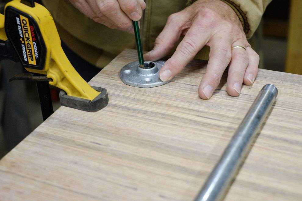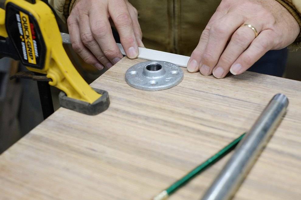 Для начала на одну из досок кладем фланцы в каждом углу. Они должны быть установлены на одинаковом расстоянии, поэтому воспользуйтесь рулеткой для более точных измерений.