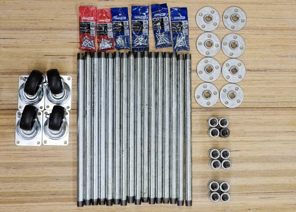 Стеллаж из труб также нужно тщательно подготовить – сталь можно заранее покрасить, если стандартный цвет не подходит.