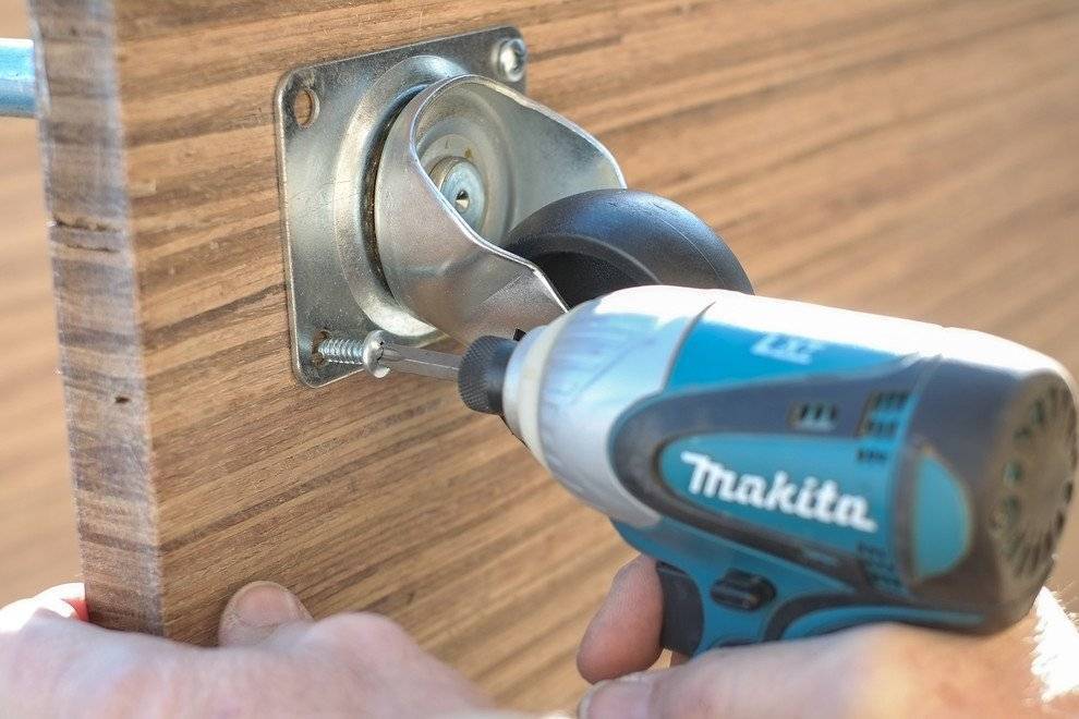 Кладем стеллаж на бок и приступаем к установке колес. Для этого делаем отметки карандашом, чтобы они располагались на одинаковом расстоянии и прикрепляем колеса шурупами.