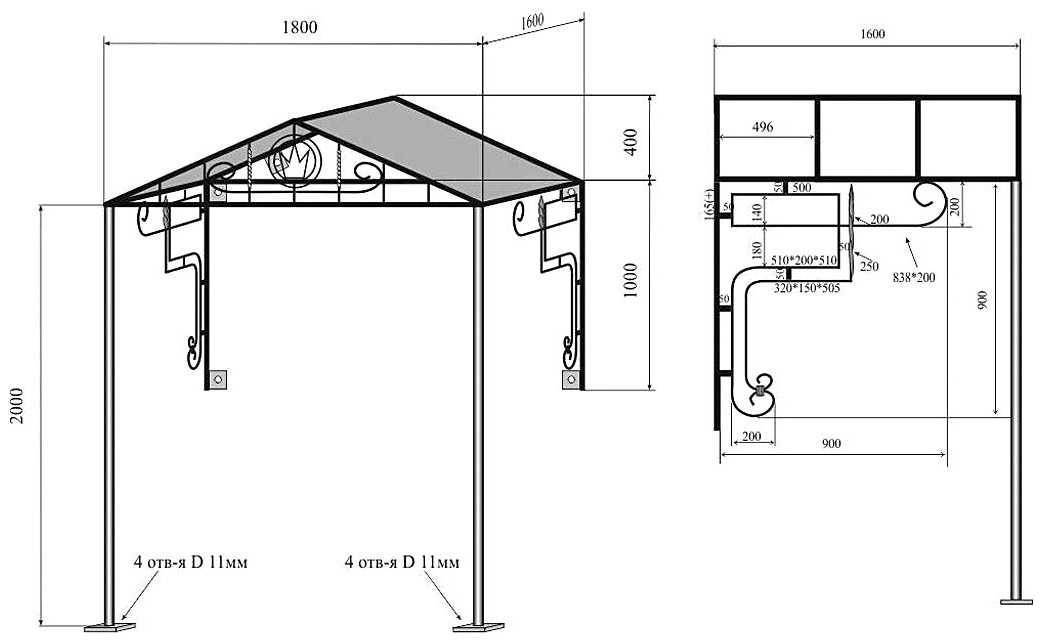 Красивый двускатный навес над входом, из стальной трубы с фигурными упорами и столбами (схема с размерами)