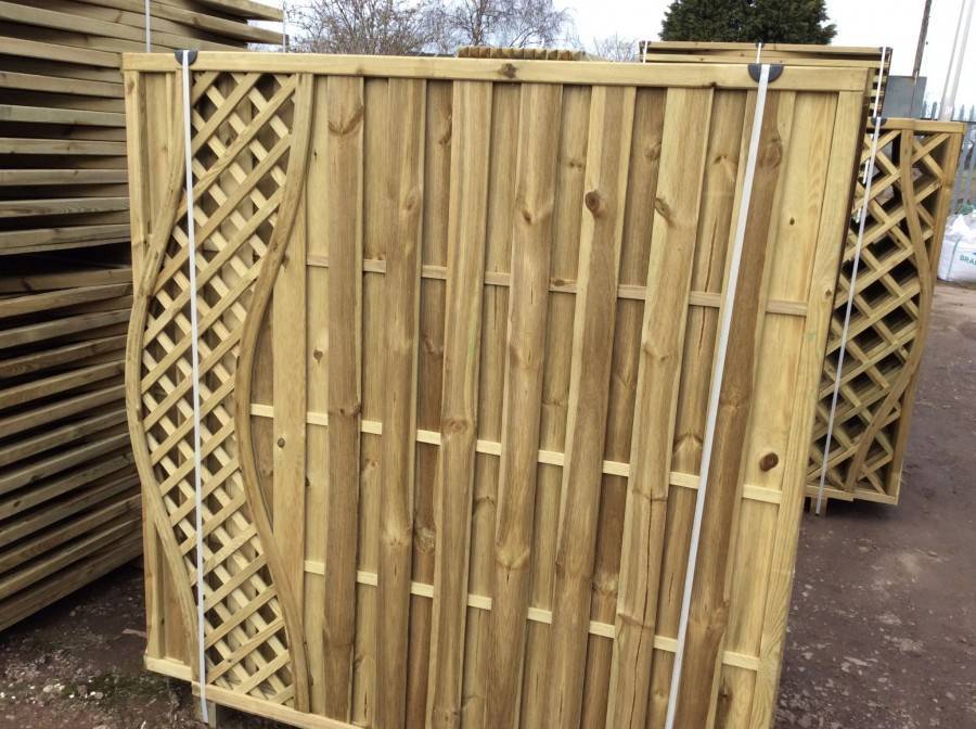 Очень красив деревянный забор с различными вставками. Например, на фоне сплошного забора могут быть ажурные вставки – в виде крупных ромбов, квадратов, кругов, прямоугольников из деревянной диагональной «сетки».