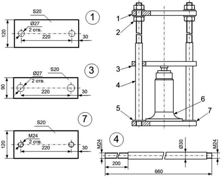 Схема изготовления : 1 – верхняя силовая платформа, 2 – гайки, 3 – нижняя платформа, 4 – шпильки диаметром 30 мм, 5 – нижняя резьба шпилек, 6 – гидравлический домкрат бутылочного типа; 7 – основание толщиной 20 мм