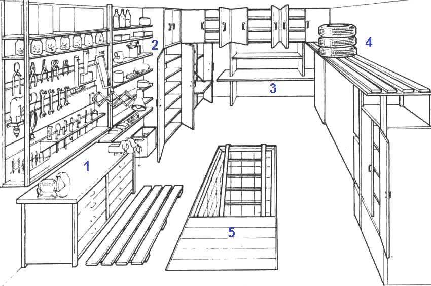 Пример размещения в гараже полезных приспособлений: 1 – с ручными станками, 2 – стеллажи и шкафы, 3 – стол для проведения различных ремонтных работ, 4 – полка для хранения шин, 5 – смотровая яма
