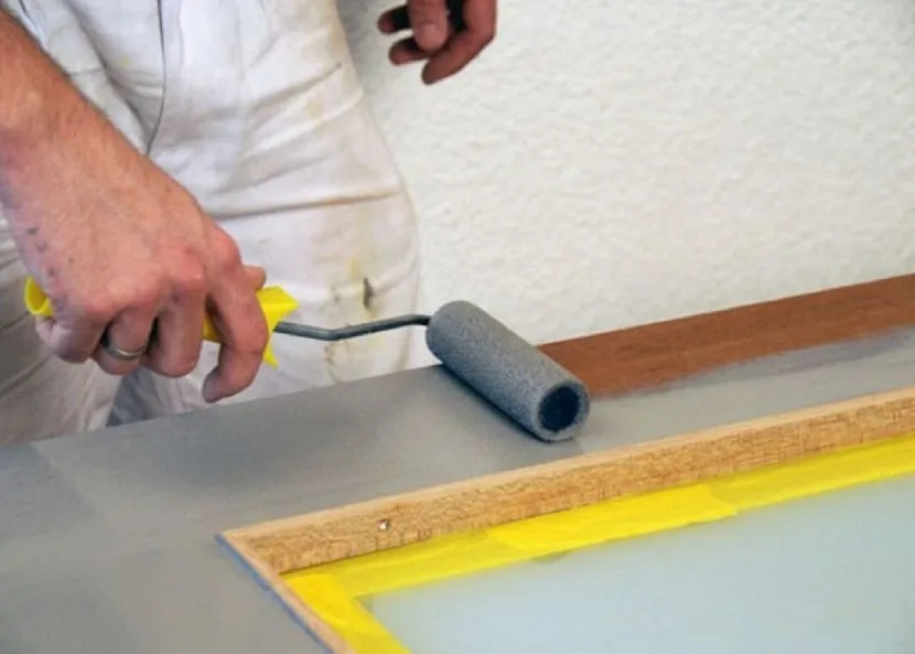 Подготовленное дверное полотно (после заделывания дефектов и нанесения грунтовки) покрывают веществом при помощи небольшого валика.
