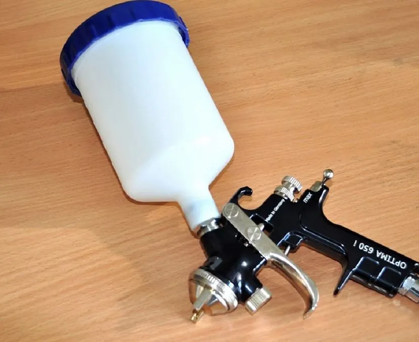 Если нужно профессиональное нанесение с одного подхода, тогда лучше отдать предпочтение пульверизатору. Краскопульт облегчит применение не только ЛКМ, но и грунтовки. В аппарате используют более жидкую эмаль, чем при ручной работе. Минус – большой расход красящего состава.
